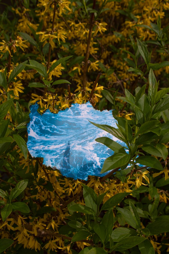 This photograph was taken in April 2019. I shot this for an assignment. The class had to print an image of anything we wanted and take a shot with it. But we had to physically alter the image. I decided to print out some clear blue water. I then burned most of the print and then found a bush with blooming flowers to place it on. I think people really enjoyed this shot.